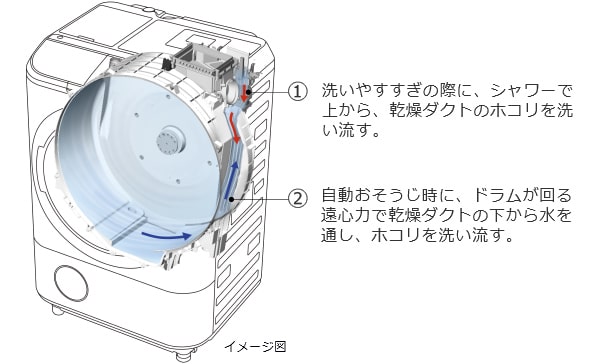 Ống dẫn sấy của máy giặt bị bẩn, quần áo có thể lâu khô hơn. Bằng cách tự động xả sạch bụi trong ống dẫn mỗi khi rửa, bạn có thể giảm sự suy giảm hiệu quả sấy khô và giúp bảo trì dễ dàng hơn.
