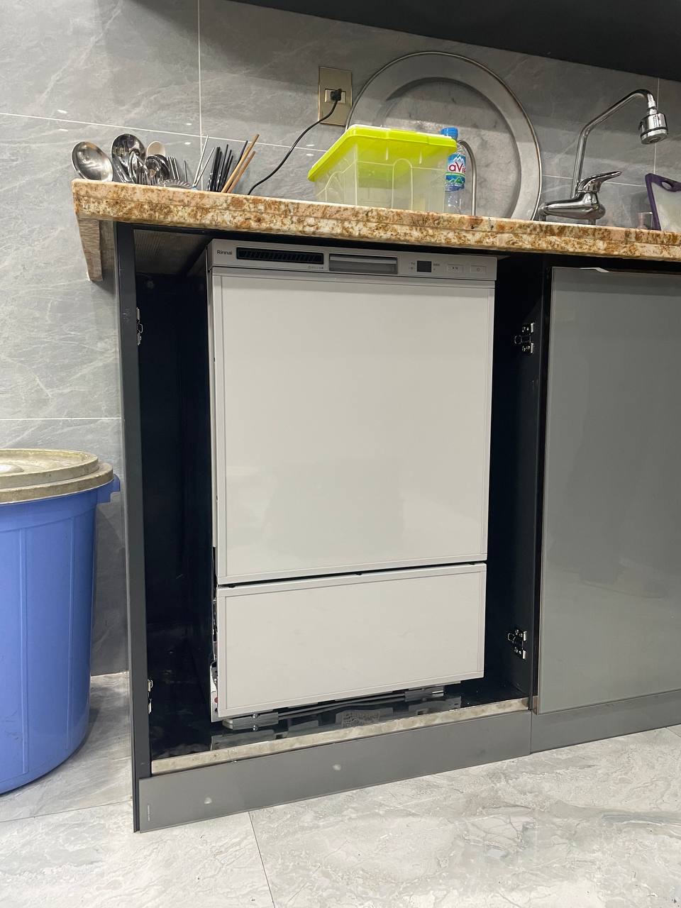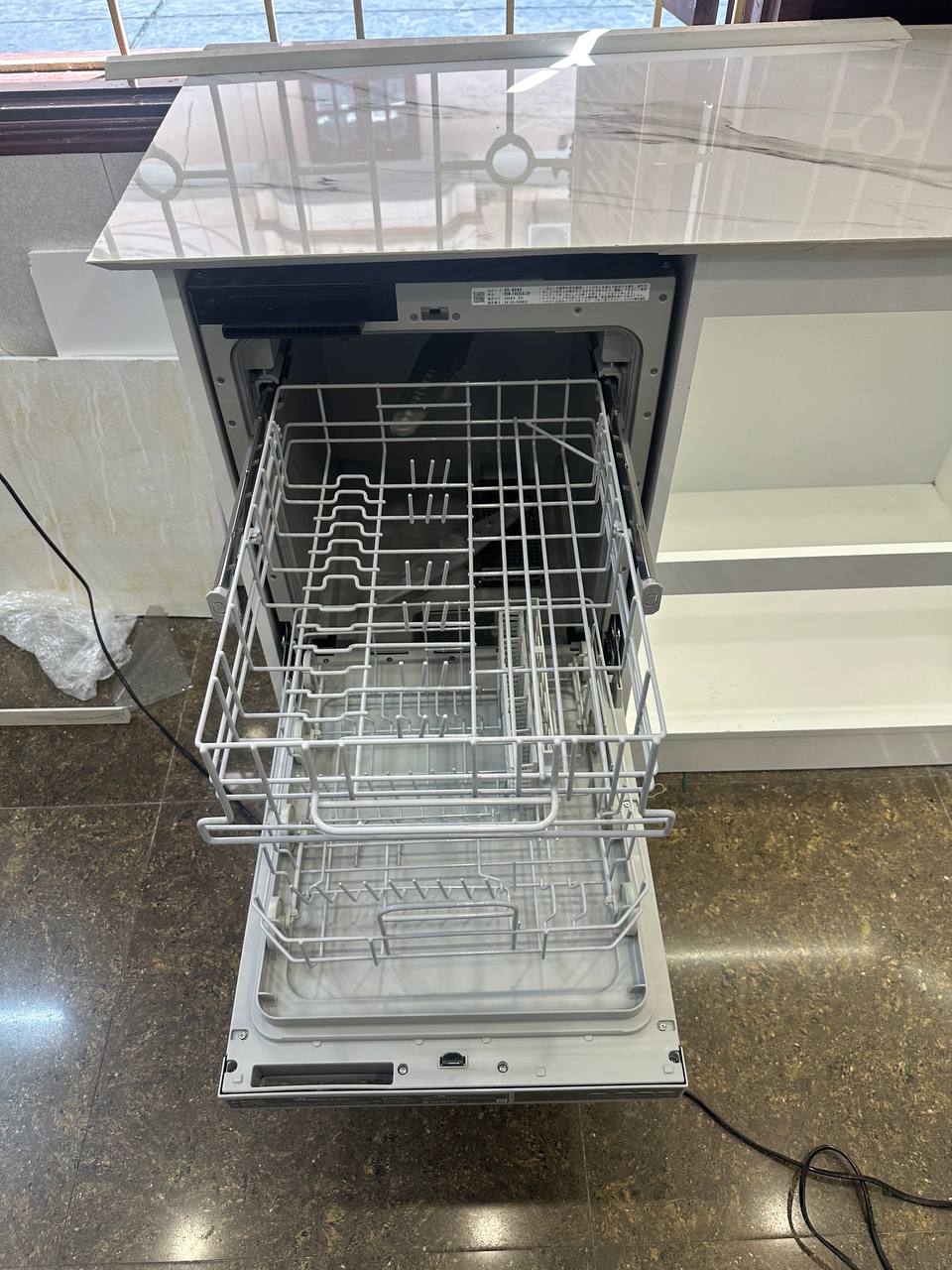 Nhà mình chọn thiết bị trước mới lên thiết kế nên lắp mẫu này vừa y luôn, shop giao hàng mới nguyên hộp nguyên đai sản xuất năm 2024, các khay rộng rãi nên khá dễ xếp bát đĩa và đồ dùng, công nhận là nó đúng như quảng cáo, k cần muối rửa hay nước làm bóng mà bát đĩa vẫn sạch bóng.