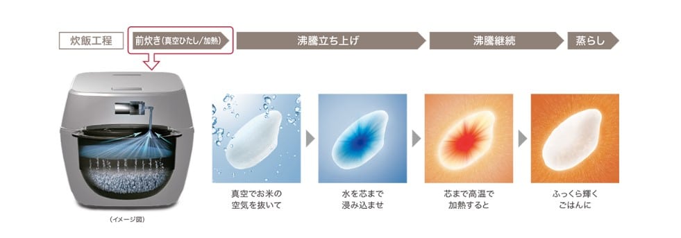 Không khí bên trong nồi được thoát ra và hơi nước nhanh chóng thấm vào lõi hạt gạo nhờ sự chênh lệch áp suất. Gạo hấp thụ nước sẽ truyền nhiệt vào bên trong và thúc đẩy quá trình hồi hóa. Thành phẩm cơm ngon sẽ được tạo ra trong khoảng 38 phút. Quá trình hút chân không này cũng làm ngăn chặn sự ngả vàng của gạo và sự bay hơi của nước do quá trình oxy hóa, giữ được độ trắng và thơm ngon cho cơm trong vòng 40h.