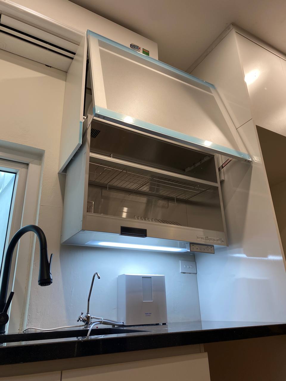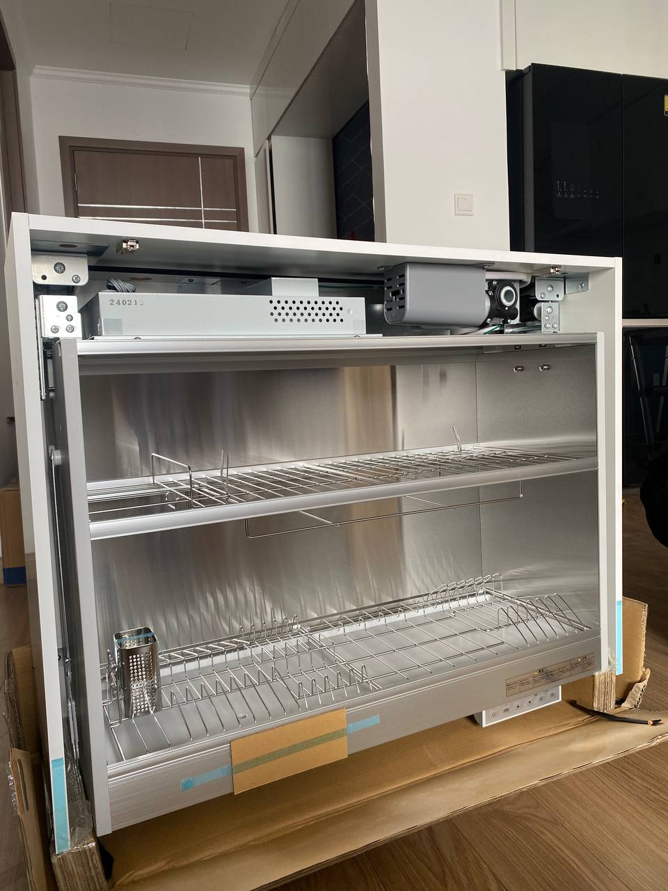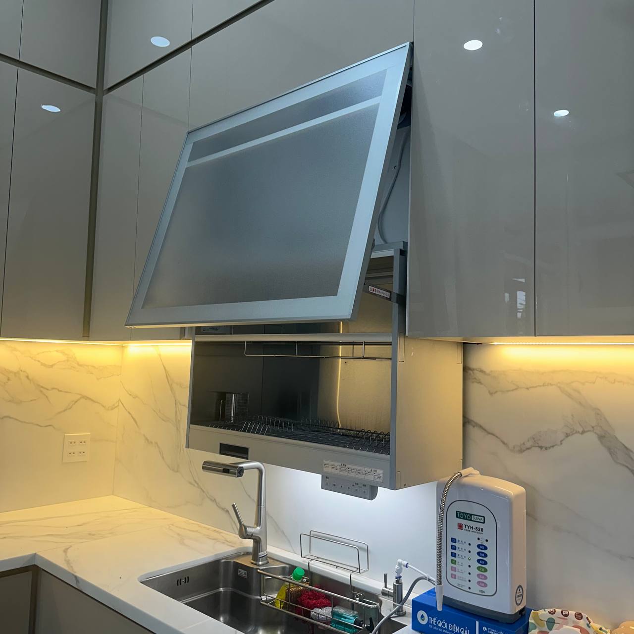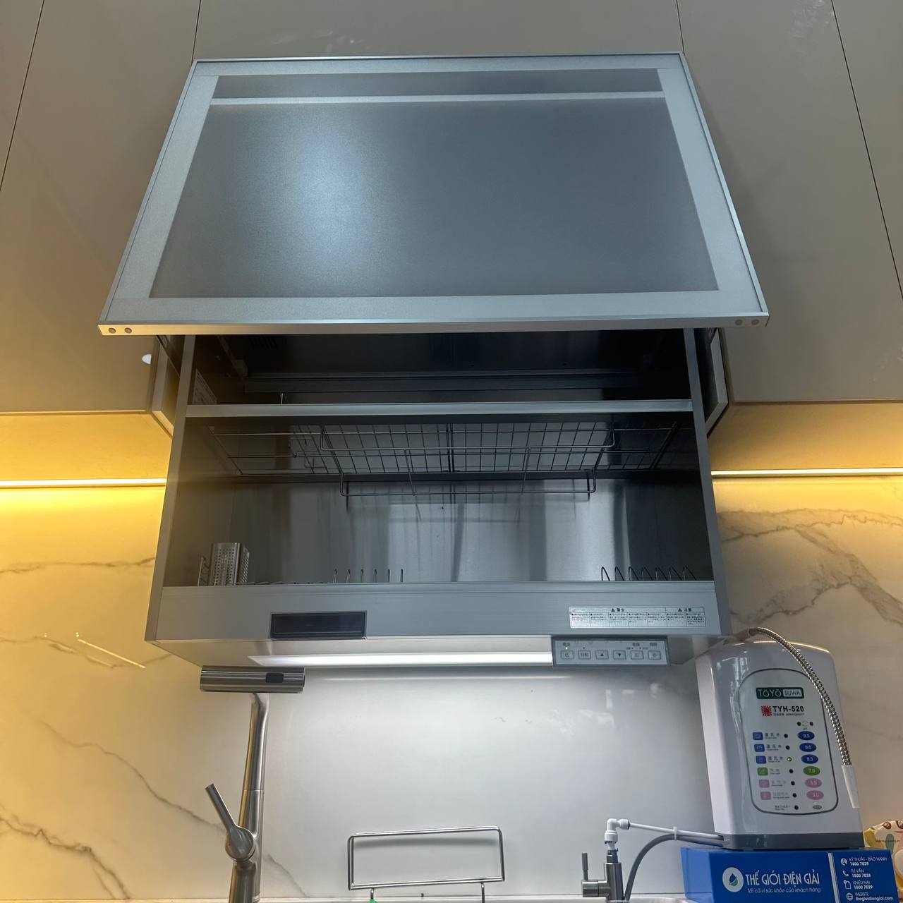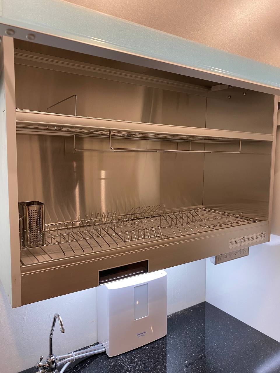 Tủ sấy bát nâng hạ này quá tiện luôn, tiết kiệm diện tích lại sấy bát đĩa khử khuẩn nữa
