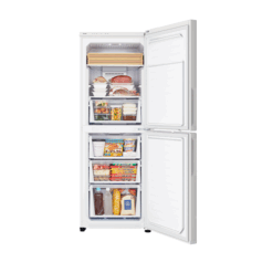 Cửa dưới bao gồm các hộp đựng có ngăn kéo trượt, rất tiện lợi để bảo quản thực phẩm đông lạnh trong thời gian dài hoặc lưu trữ kem cho trẻ nhỏ. Thiết kế này giúp tối ưu hóa không gian và nâng cao hiệu quả sử dụng trong gia đình.