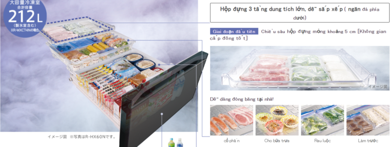 | Cấu tạo tủ lạnh | Ngăn đá rơi: 24 lít, Ngăn đông lớn: 125 lít, Ngăn đông nhỏ: 33 lít, Ngăn mát 317 lít, Ngăn rau củ 118 lít |